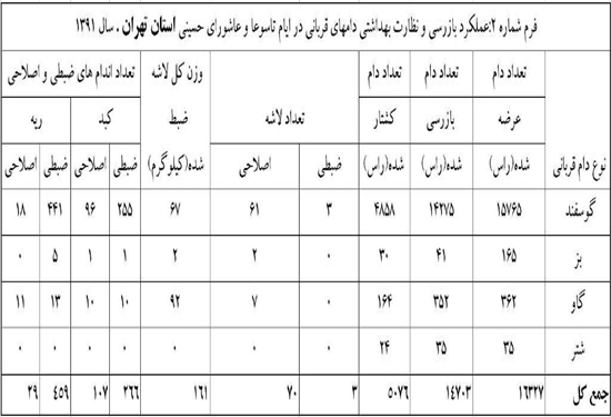وی اضافه نمود در این طرح كه با حضور بیش از 110 نفر دكتر دامپزشك و كارشناس بازرس گوشت اجرا شد در مجموع در ایام تاسوعا و عاشورای حسینی تعداد 14703 راس دام عرضه شده مورد بازرسی بهداشتی قرار گرفته اند. آمار نهایی این طرح مطابق جدول زیر اعلام میگردد: